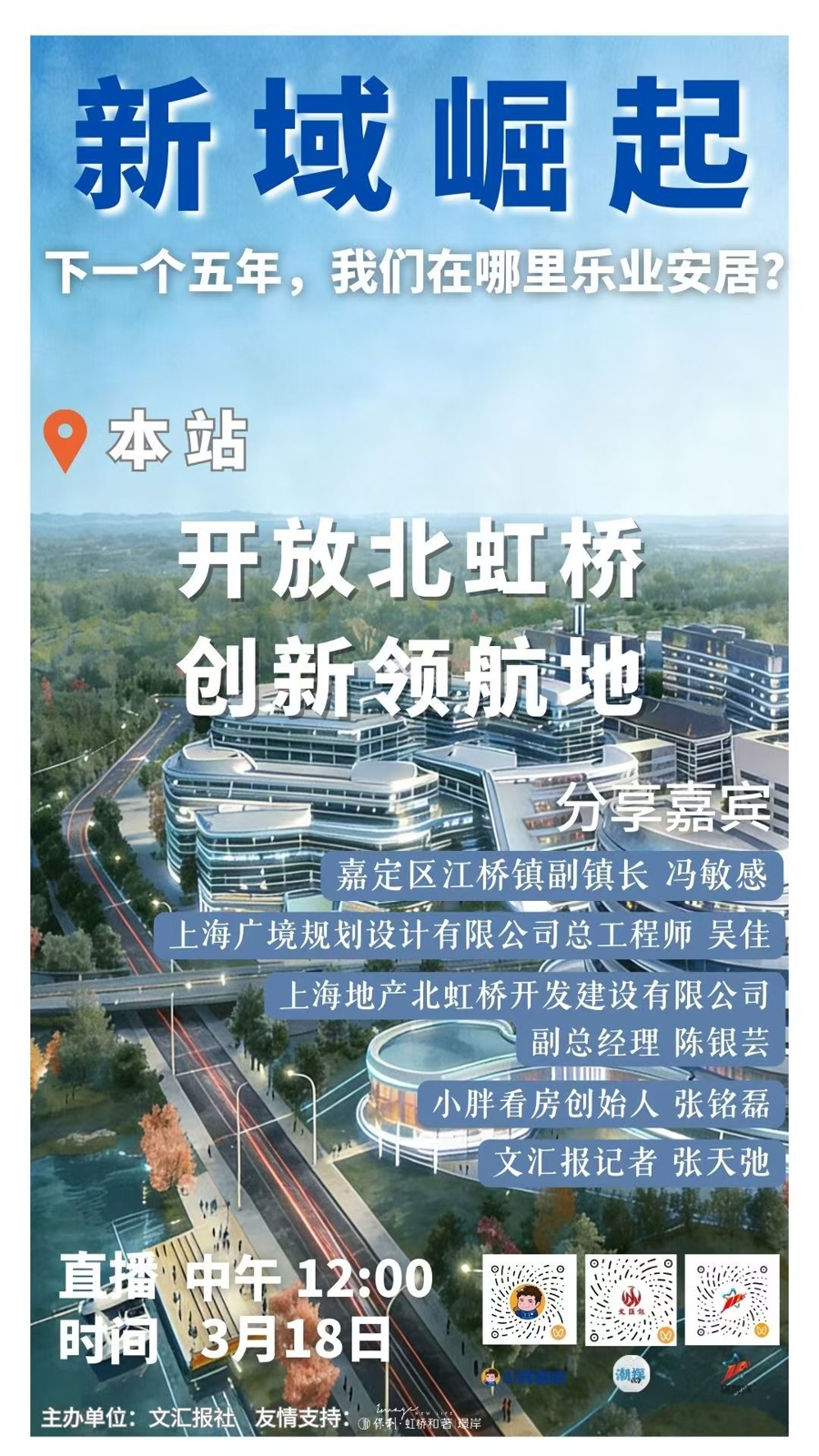 3月18日,“新域崛起——下一个五年,我们在哪里乐业安居”系列直播走进嘉定江桥镇,嘉定区江桥镇副镇长冯敏感、上海地产北虹桥开发建设有限公司副总经理陈银芸、上海广境规划设计有限公司总工程师吴佳、小胖看房创始人张铭磊做客直播间,解读上虹桥·城市更新区以产城融合为路径,探索城市片区发展的新范式。
